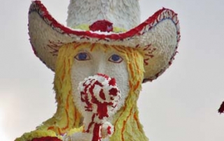 Al igual que aquí, su reglamento indica como deben ir revestidas las carrozas. En su caso deben estar ser cubiertas en su totalidad por materiales naturales tales como flores, semillas, plantas o cortezas de frutos secos.
